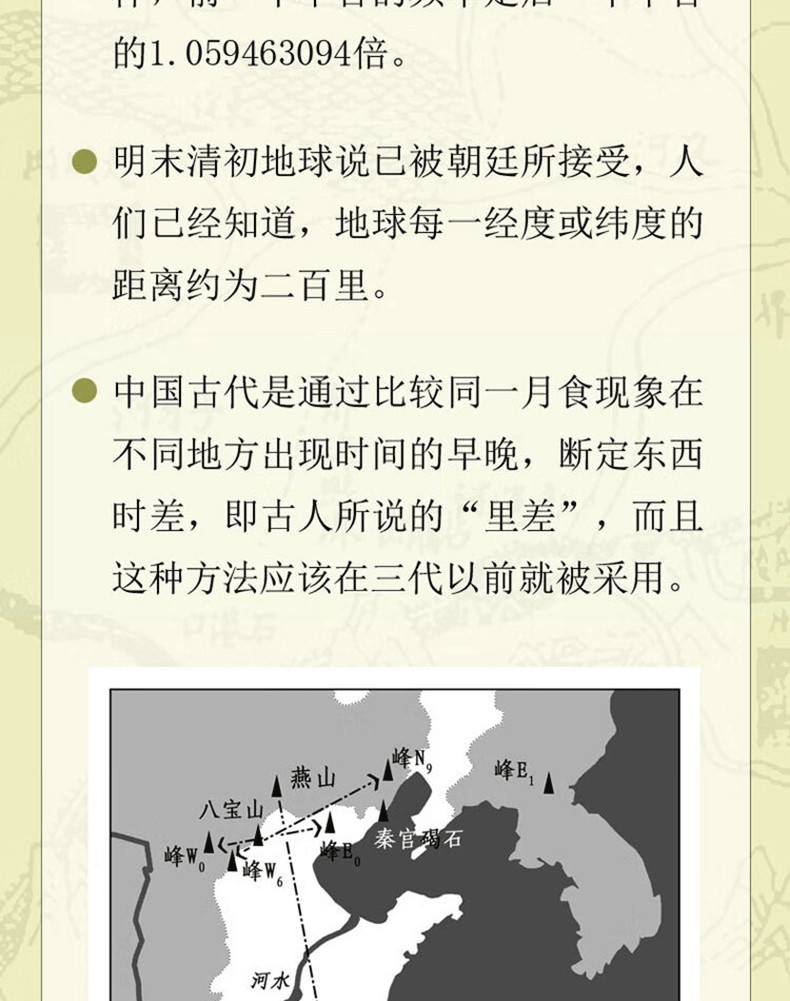 書初版後,我繼續在《四庫全書》和其他資料中尋找可能的線索。又花了一年多的時間,我發現清代典籍有利用時差推算東西距離的記載。乾隆年間,清廷曾透過觀測不同地方的中星偏度和去極高度,在新疆地區進行大規模的測量工作。這對我的研究來說是一個極為重要的啟發,但答案並不因此而全然明了。清初西方的機械鐘(即輪鐘)已傳人中國,人們可以憑藉輪鐘將京師的標準時間帶到任何一個地方,從而很容易知道不同地方的時差,並以此推出任何兩地的東西經度差;而任何一個地方的緯度則可以憑藉觀測北極高度角得到。另外,明末清初地球說已被朝廷所接受,人們已經知道,地球每一經度或緯度的距離約為二百里。這樣,人們可以先測得兩地的中星相對京師的偏度差(時差)和去極高度差(緯度差),然後透過勾股定理或作圖推算出兩地的直線距離,最後形成大範圍的地圖。清代的《欽定河源紀略》就列出了新疆主要城鎮的中星偏度和去極高度數值,以此決定這些地方的定位座標。有了這樣的數據,任何兩地的方位也很容易確定。同樣,有了這樣的坐標體係就可以把依照裴秀「製圖六體」原則繪製的相對較小範圍的.測繪成果連結起來,形成全國地圖。這些內容都是目前中國古代測繪技術發展史□□□未涉及的。
