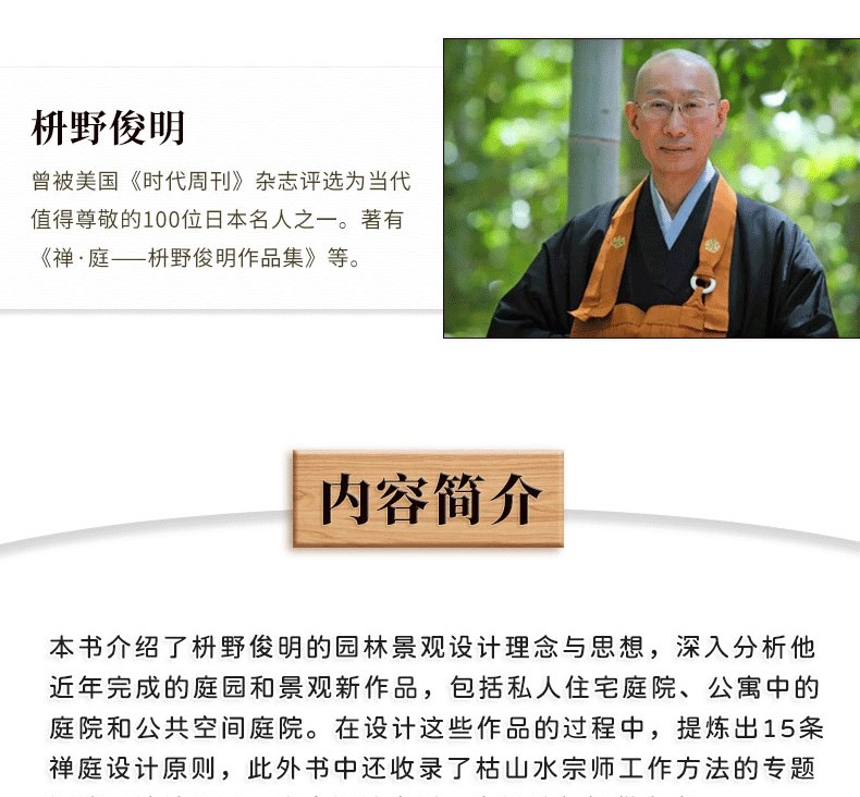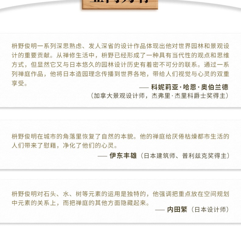 1 作者權威:枡野俊明擁有近40年的景觀設計經驗,在世界各地完成了眾多的設計項目,屢獲大獎。其作品準確地繼承了日本傳統庭園的精髓,並結合現代的語境,帶給人們視覺與心靈的雙重享受。