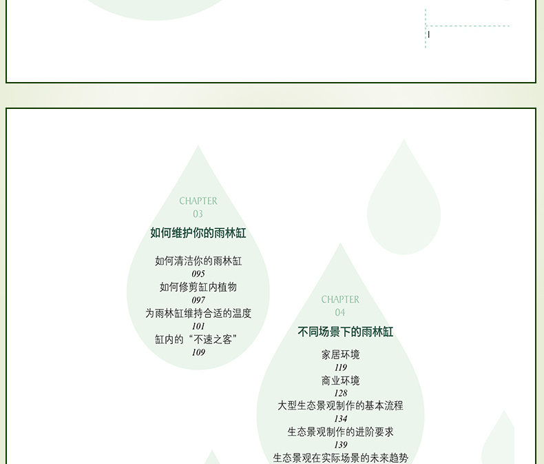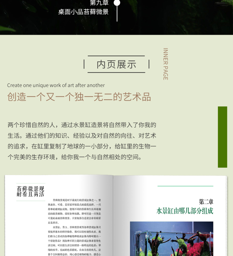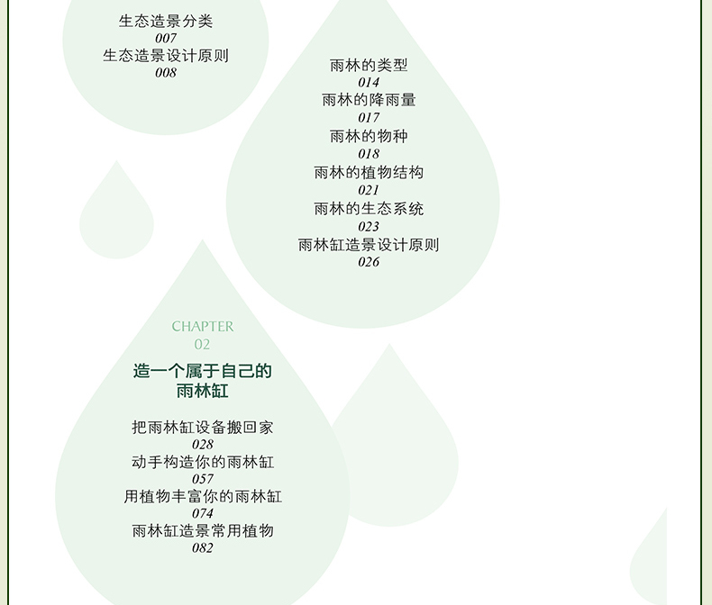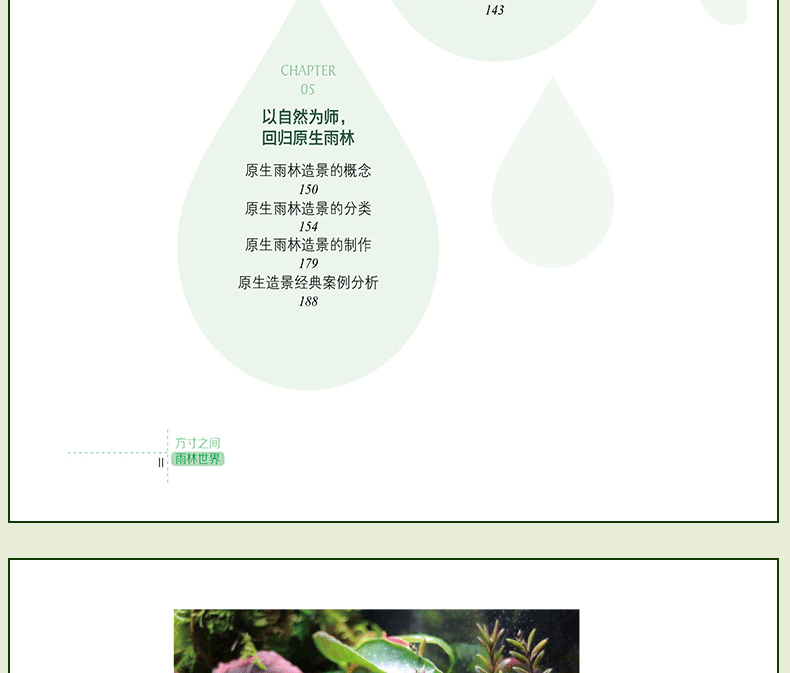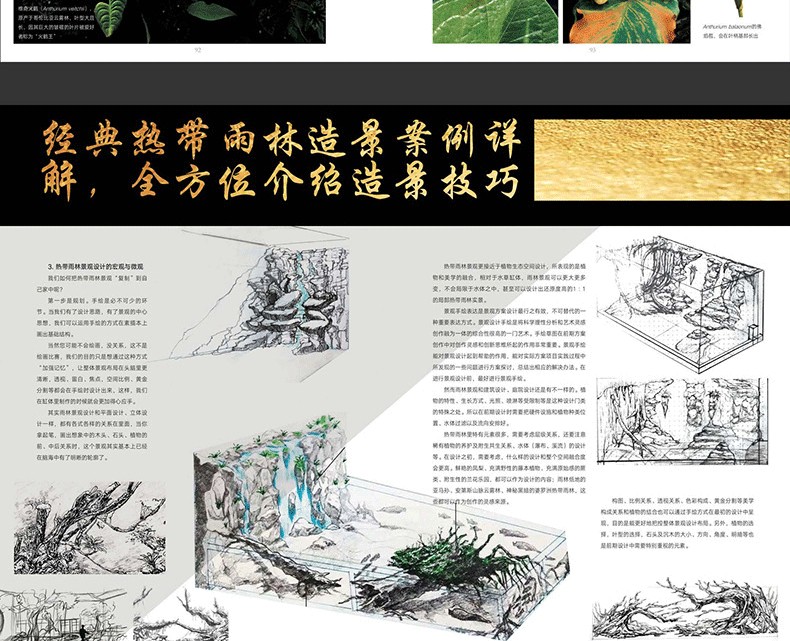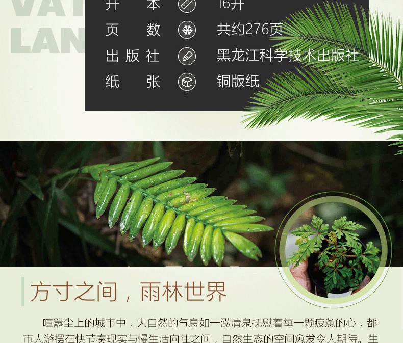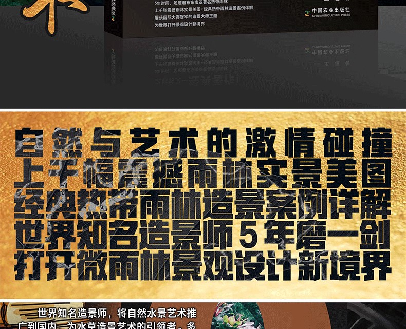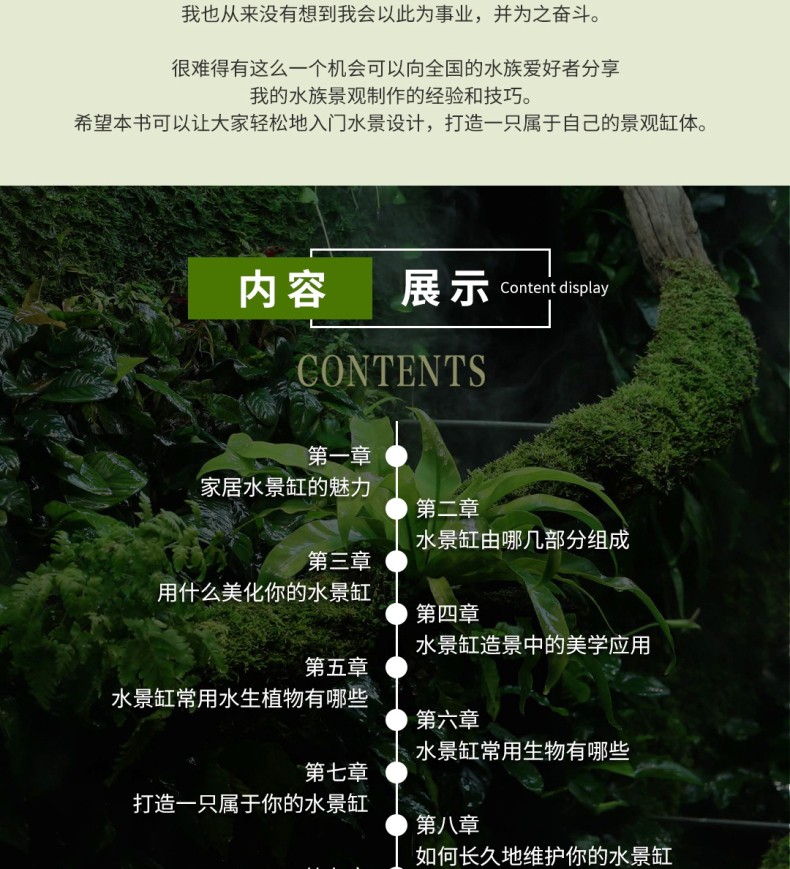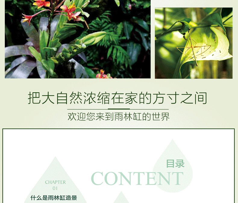 本書是在2015年8月出版的《水草造景藝術:從入門到精通》一書的升級、延伸收藏版。在內容上,在水草造景的領域之外,拓展視野,就熱帶雨林景觀整體設計做了詳細闡述和實操介紹。並加大力度介紹了當下*流行的主流熱帶雨林景觀設計的設計風格和製作過程,本書**的亮點是具有很多領域的開創性:一是**次系統闡述熱帶雨林景觀設計的設計原則和方法;二是全部圖片來自作者實地考察5個熱帶雨林的實拍圖片;三是介紹了大量的熱帶雨林景觀設計需要用到的熱門植物。全書有理論有分析,有製作過程,內容豐富多彩,是一本值得熱帶植物景觀設計愛好者收藏的精美圖書。
