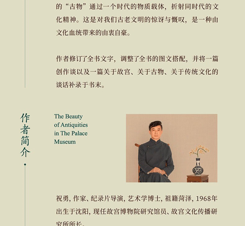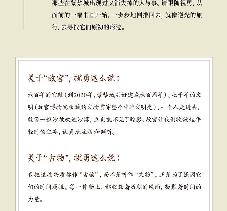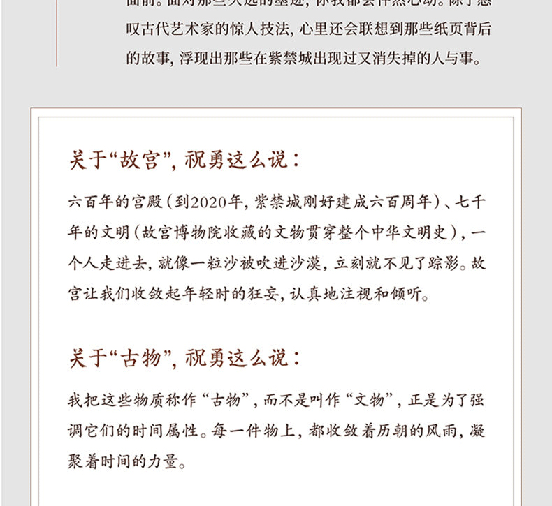 《故宮的古物之美》是祝勇繼《故宮的風花雪月》《故宮的隱秘角落》《在故宮尋找蘇東坡》之後推出的又一部“故宮美文”。在這本書中,祝勇選取了18件故宮藏品,以18篇散文講述一件件國家寶藏的前世今生,連綴起一部故宮裡的藝術史,再現中華文明的營造之美。祝勇筆下的“古物”通過一個時代的物質載體,折射同時代的文化精神。這是對我們古老文明的驚訝與慨嘆,是一種由文化血統帶來的由衷自豪。