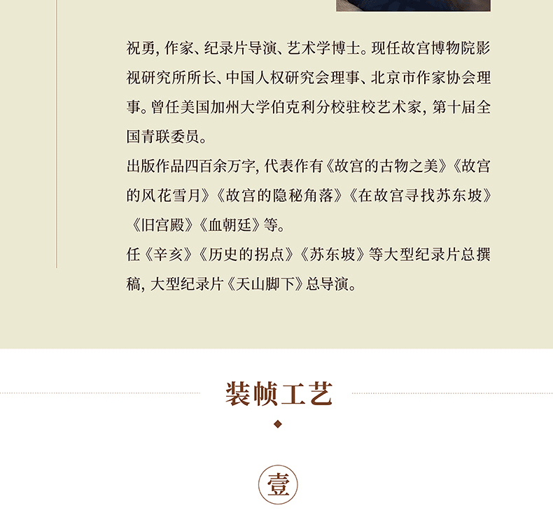 祝勇,作家、紀錄片導演,藝術學博士,祖籍菏澤,1968年出生於瀋陽,現任故宮博物院研究館員、故宮文化傳播研究所所長。主要作品有《故宮的古物之美》《故宮的古畫之美》《故宮的書法風流》《在故宮尋找蘇東坡》等數十部著作。 “祝勇故宮系列”由人民文學出版社出版。任《蘇東坡》等十餘部大型紀錄片總編劇,獲金鷹獎、星光獎等多種影視獎項。任國務院新聞辦、中央電視台大型紀錄片《天山腳下》總導演,該片入選“新中國七十年紀錄片百部典藏作品”。