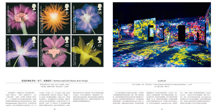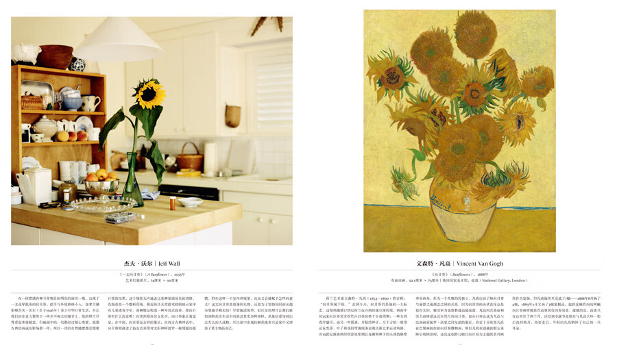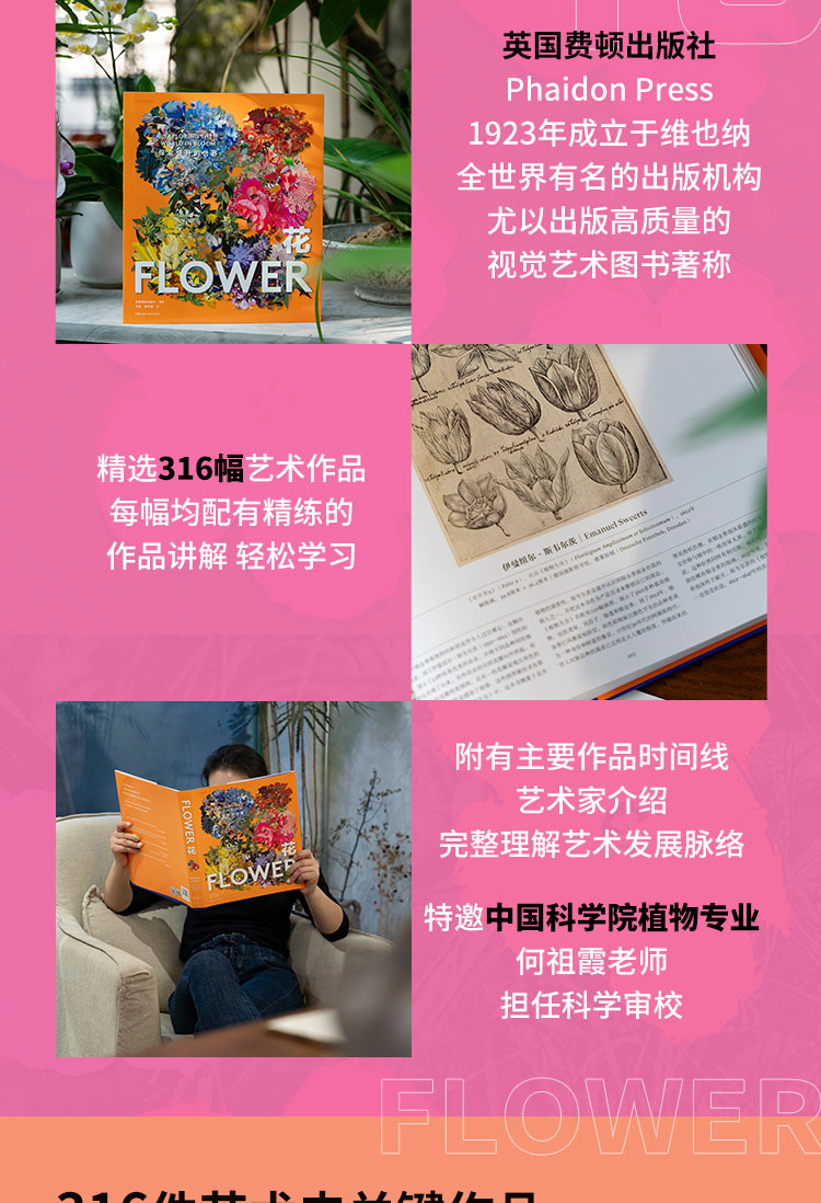 本畫冊收錄316幅花卉主題藝術作品,15萬字詳述。作品涵蓋繪畫、素描、寫生、植物插畫、攝影照片、濕壁畫、古代文物、插花作品、現代裝置、商標設計、影視劇照等多種類型,藝術家包括達文西、大衛·霍克尼、草間彌生、亨利·馬蒂斯、亞歷山大·麥昆、克勞德·莫奈、威廉·莫里斯、喬治亞·歐姬芙、皮埃爾- 約瑟夫·雷杜德等等。