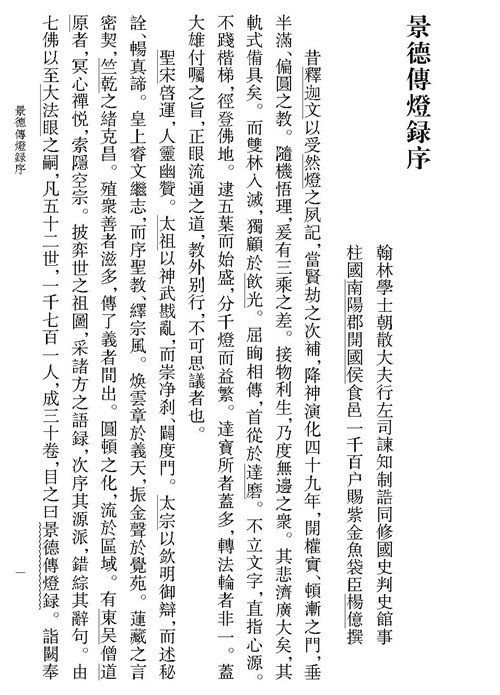 《景德傳燈錄》,三十卷,北宋道原撰,記錄自過去七佛至法眼文益禪師歷代禪宗諸祖五家五十二世、共一千七百零一人的傳燈法系,尤詳於南嶽懷讓(八卷)、青原行思(十三卷)兩個系統,是研究禪宗形成、發展及流傳不可或缺的史料。體制上,《景德傳燈錄》融合譜錄體與記言體為一統,以譜錄為經,以記言為緯,嚴整而靈動。