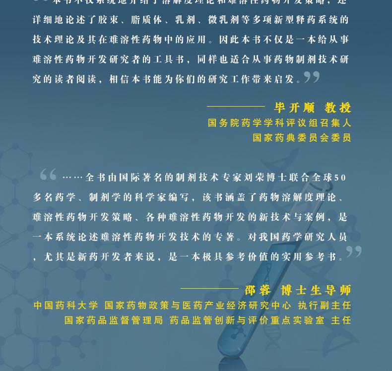 本書原著為第三版,是一部經典的藥物製劑參考書。本書全面闡述了難溶性藥物的開發技術與工藝,為難溶性藥物開發過程中,藥物溶解度問題的解決,提供循序漸進的科學方法。全書共23章,系統性闡述了與難溶性藥物開發相關的溶解度、溶解度預測模型、處方前研究方法、生物藥劑學、藥動學、指導原則及各種可用於難溶性藥物開發的藥物傳遞系統。本書幾乎囊括了難溶性藥物開發技術近期新的研究資料與數據,詳細介紹了15項可用於難溶性藥物開發的藥物傳遞系統及其相關技術,並透過詳細的案例研究與分析,闡述了這些技術在口服製劑與注射劑的應用。本書適用於新藥製劑研究開發人員,也可供相關院校大學師生參考。