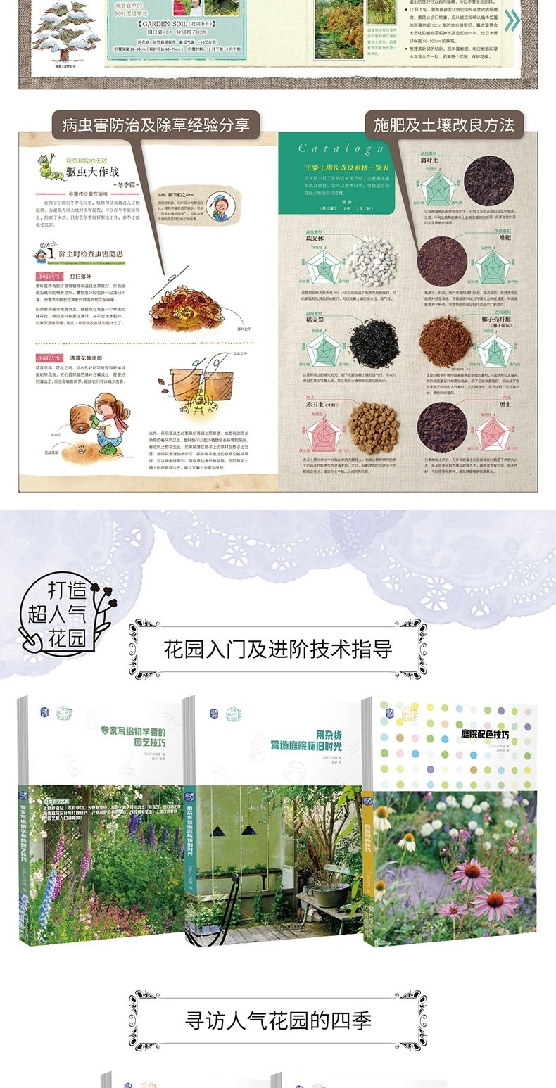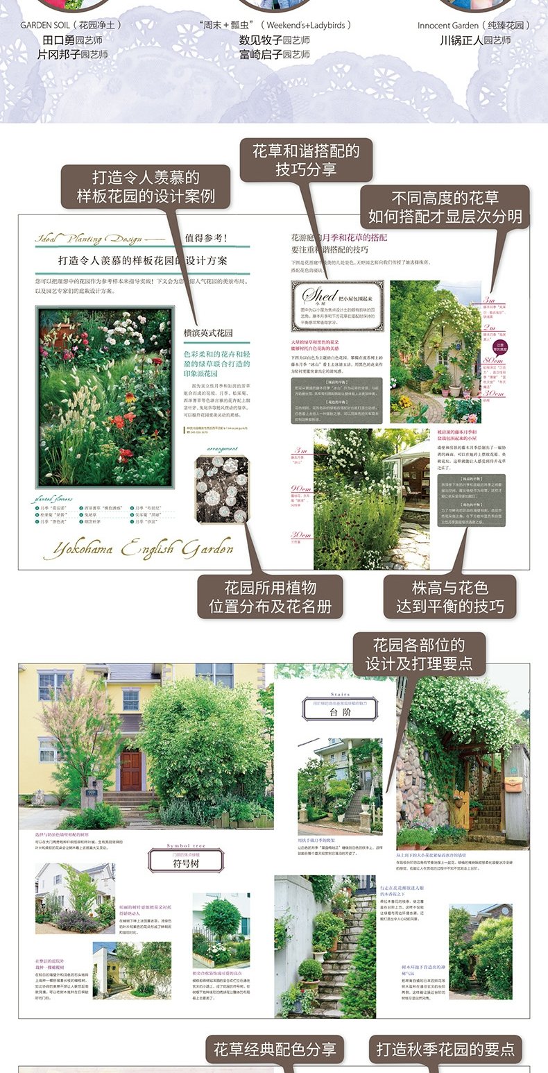 本書由日本多位專家為園藝初學者獻計獻策,用大量案例和實用妙招為想親手打造美麗自家花園的讀者提供捷徑,主要包括打造令人羨慕的樣板花園的設計方案,花草搭配及草坪打 理要點,開放式庭栽及迷人路徑的設計要點,有缺陷的花園該如何改造,燈光運用技巧,如何在秋季栽種一勞永逸的球根植物,怎樣把冬季花園打理得層次分明,值得借鑒的花草過冬 技巧,四季驅蟲妙招,春季除草、改良土壤及打理花園技巧。