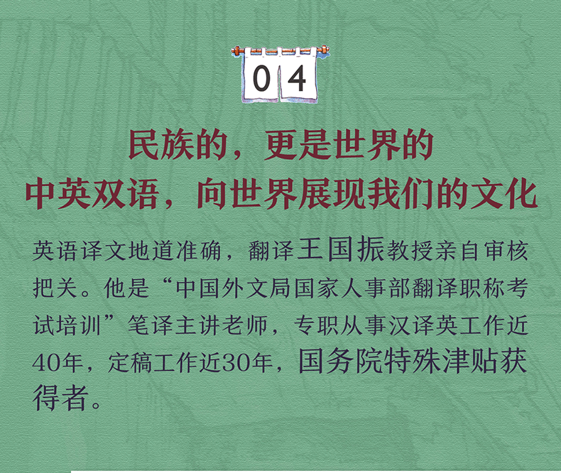 特色5:民族的,更是世界的。 中英雙語,向世界展現我們的文化。 英文譯文地道準確,王國振教授親自審核把關。
