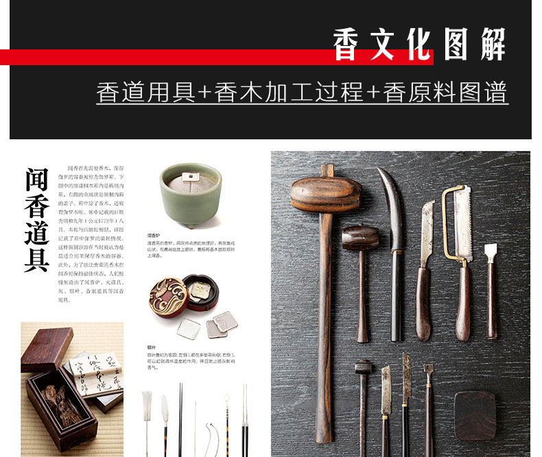 《大美中國茶:圖說香道文化》闡釋香道是一種關於“香的藝術與規律”,使讀者通過閱讀,體會到感官器官經過感性認識和理性認識,繞不同香氣對人的作用及個人的需求,了解現代廣義的香,是指香氣、芳香的氣味。 《詞源》釋詞:凡草木有芳香者皆曰香,如沉香、檀香等。狹義的香,指以天然芳香類香藥及植物黏合劑為原料,依功效的需求,依制定配方,並對香藥進行砲製及配伍,依工藝要求製成的各種香品。其中傳統香須經窖藏方可成真正意義上的香品。以及掌握由此產生的各種香品的製作、砲製、配伍與使用,而逐步形成的能夠體現出中華民族的精神氣質、民族傳統、美學觀念、價值觀念。