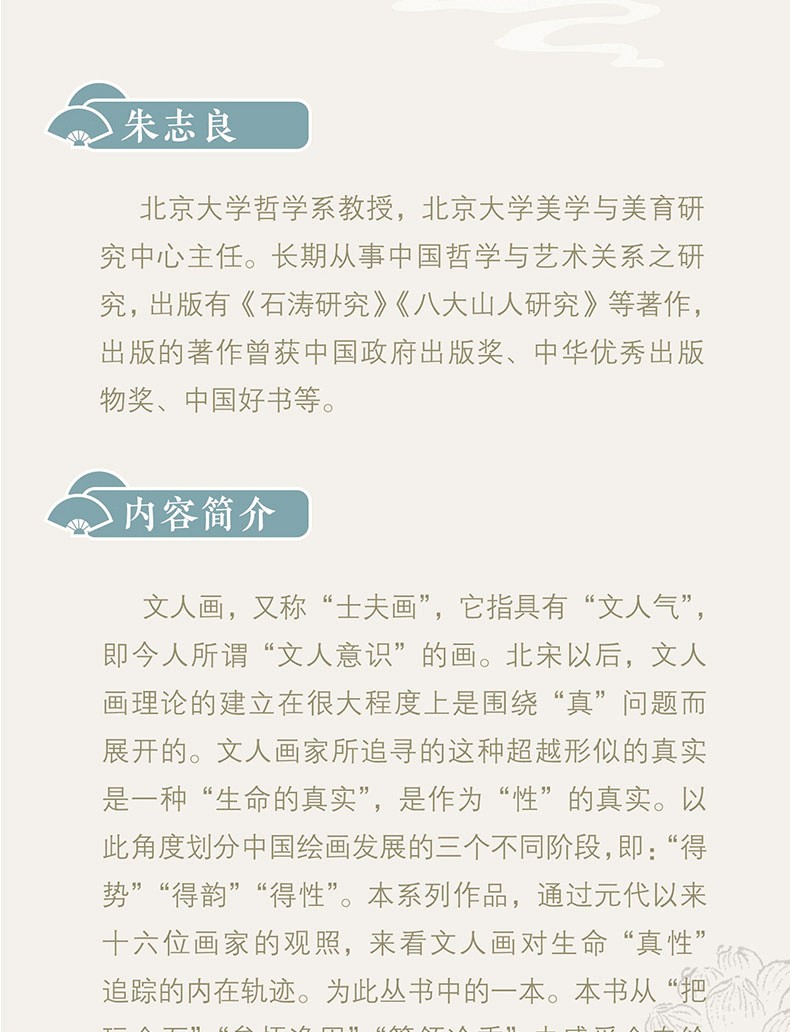 作者選擇了元代以來的黃公望、倪瓚、惲壽平、八大山人等十六位代表畫家,透過其文人畫作和藝術人生,全景勾勒文人畫的精神世界,探討文人畫的“真性”,並總結劃分了中國繪畫發展的三個不同階段:「得勢」「得韻」「得性」。 《文人畫的真性》語言明暢優美,不同於一般藝術史論的專業拗口,深具可讀性,作者致力精微卻又於細微處見知著,多有撥雲見月的妙論。