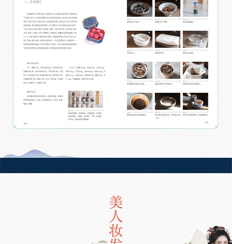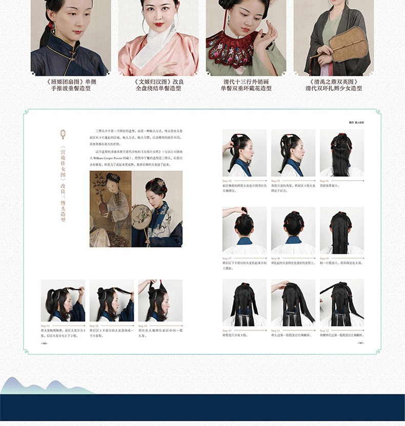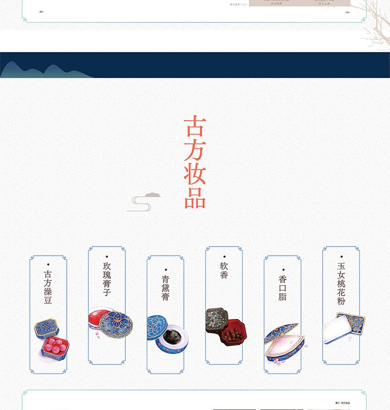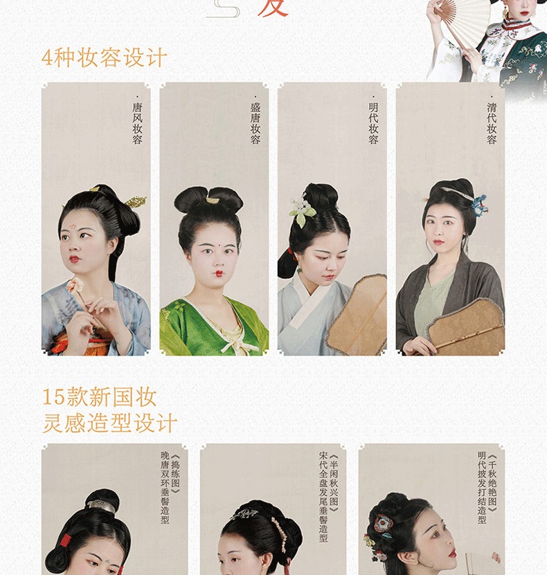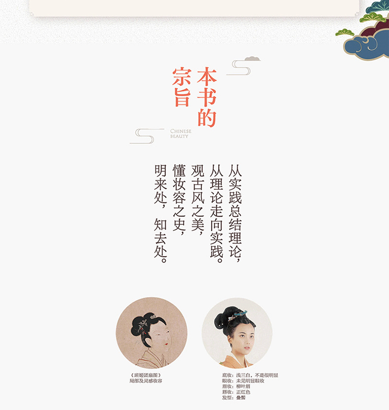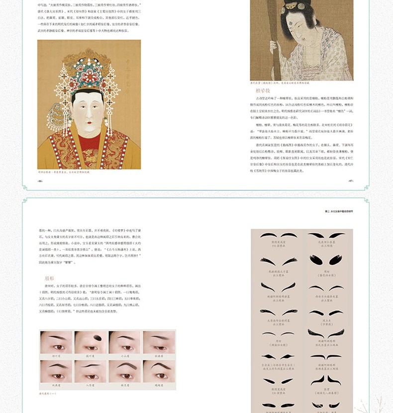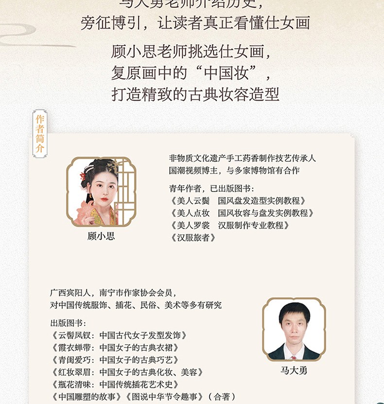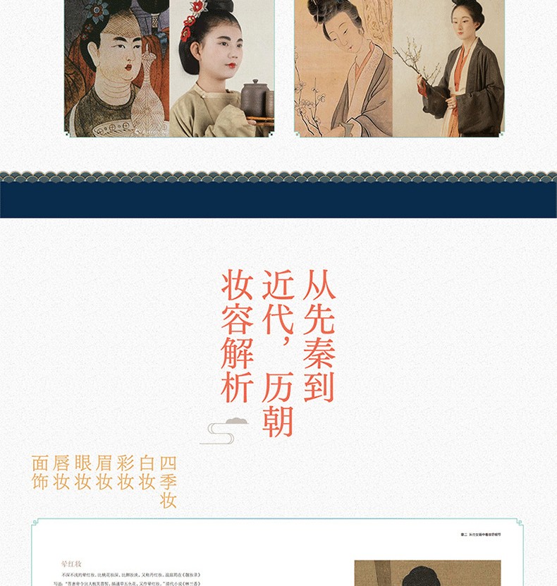 這是一本專門研究仕女畫仿妝造型的書,整體分為兩部分。前半部不僅介紹了各個□□時期的仕女畫,也透過仕女畫研究了妝容造型的□□,具有□□感和文化性。後半部是實際操作部分,介紹了仕女畫仿妝,重點清晰,步驟詳細。本書也介紹了古方妝品的製作方法和傳統首飾的製作工藝,這是同類型的化妝造型書中所沒有的,是本書的一大亮點。此外,本書還附教學視頻,可以邊看邊學。懂化妝文化,學化妝手法,來看看這本《美人出畫 從仕女畫中學國風妝容造型》吧!