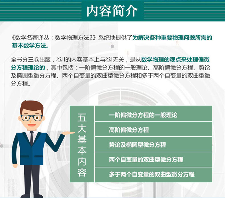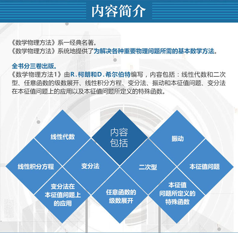 《數學譯叢·數學:它的內容,方法和意義》是著名數學價位普及數學知識撰寫的一部名著,用極其通俗的語言介紹了現代數學各個分支的內容,歷史發展及其在自然科學和工程技術中的應用。 《數學名著譯叢·數學:它的內容,方法與意義》內容精煉,由淺入深,只要具備高中數學知識就可閱讀。 《數學名著譯叢·數學:它的內容,方法與意義》共20章,分三冊出版。每章介紹數學的一個分支,《數學名著譯叢·數學:它的內容、方法和意義(第1卷)》的內容包括數學概觀、數學分析、解析幾何和代數。