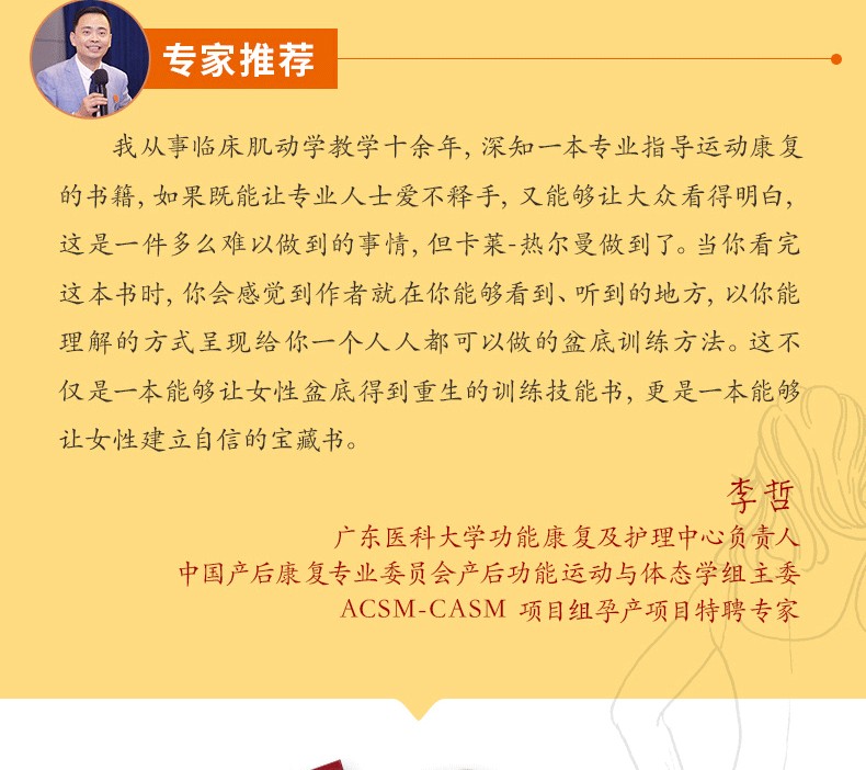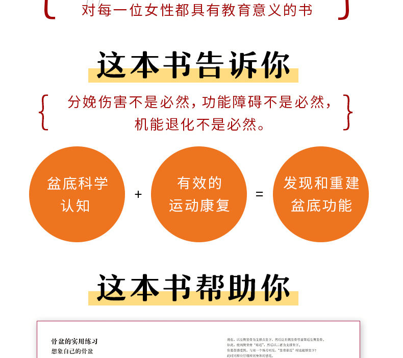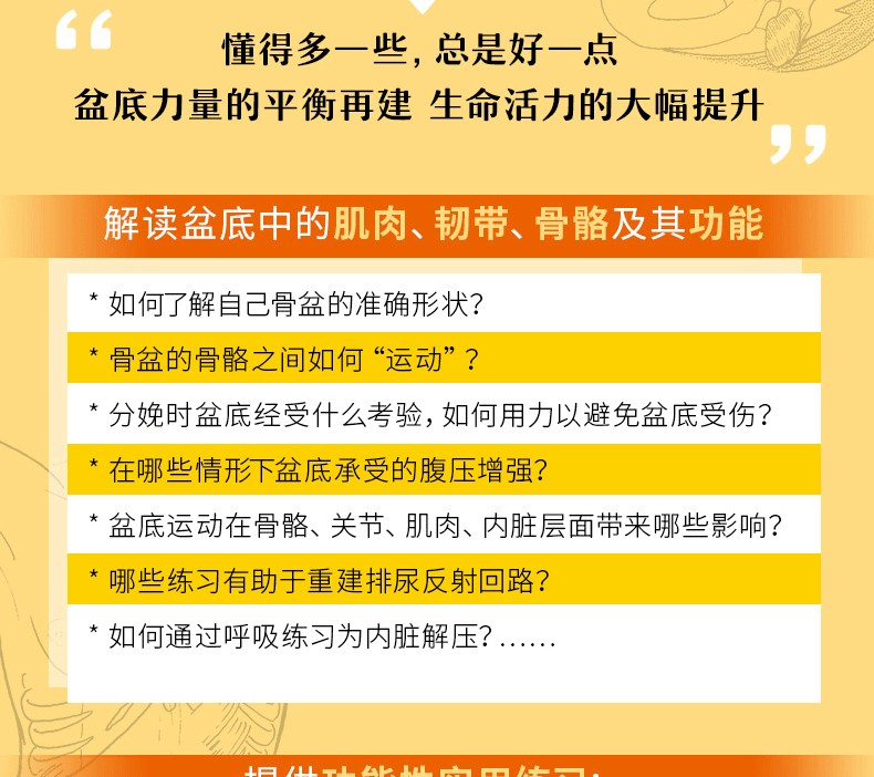 盆底對各年齡段的女性而言,都應該是重點關注與護理的部位,本書為各年齡階段的女性準備,其中部分內容會特別關注妊娠期或分娩時的女性,因為她們應更加關注盆底問題。通常女性對盆底這一部位了解甚少,也正因如此,她們對待盆底的方式也是不恰當的,而這會為她們的生活帶來諸多不便,甚至痛苦。只要我們具備一點相關知識且多加關注,就可以很好地照護盆底。在身體發生變化前及變化過程中,我們優選能提前做好準備。在本書中,你可以找到: