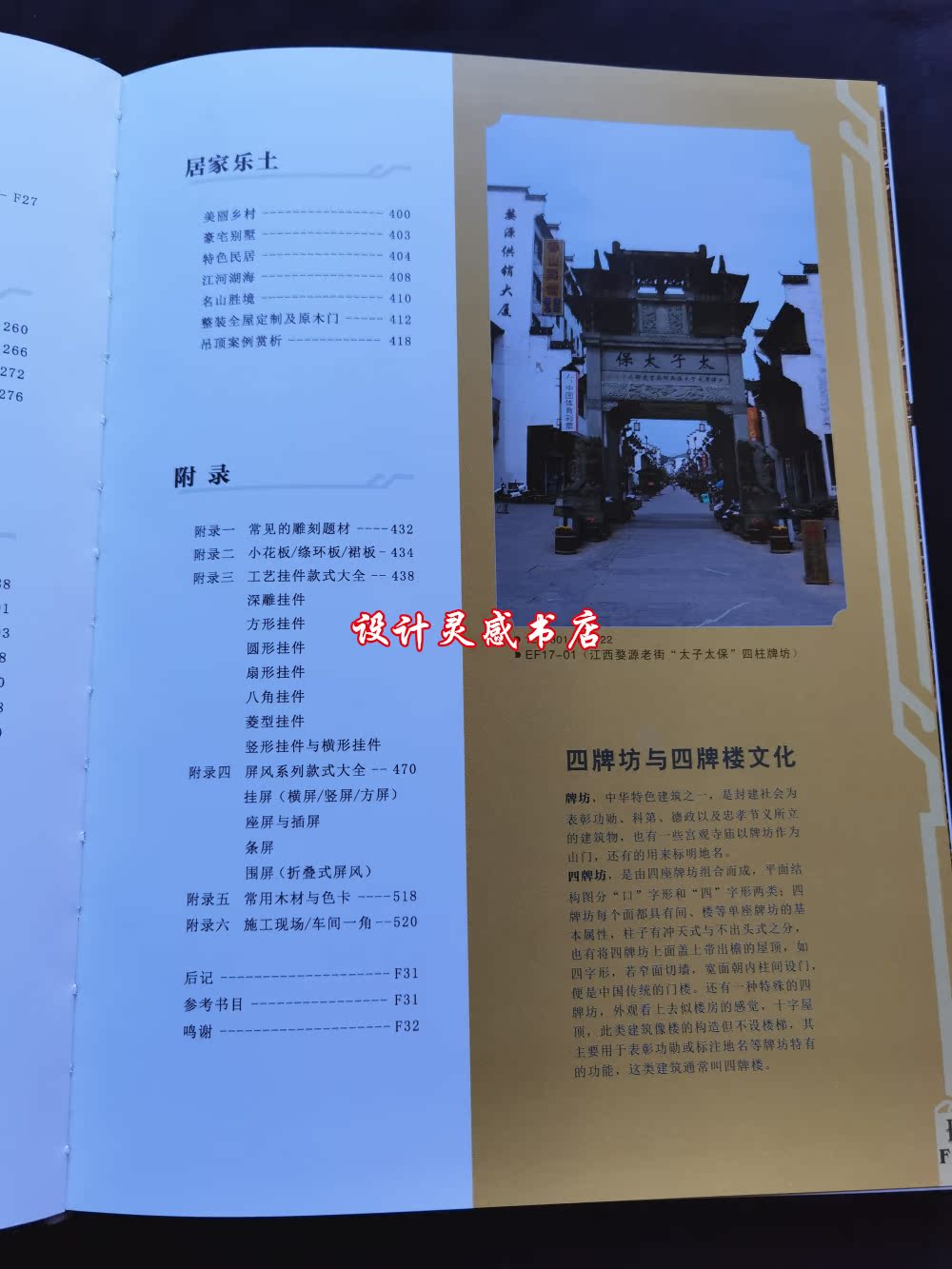 本書實景拍攝的木雕古建工程案例500餘個,涵蓋東陽木雕、仿古門窗、紅木家具行業常用的經典款式和部分原創圖片,涉及傳統、弘揚文化創新的文化建設工程,從10萬多張圖片中 精挑出最具代表性的3000多張圖片匯編成書,並輔以相關文字介紹,總共分為十章。 圖文並茂,內容詳盡,圖片高清,可作為木作裝飾、建設等相關行業的學習、設計參考用書。