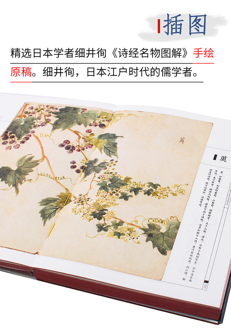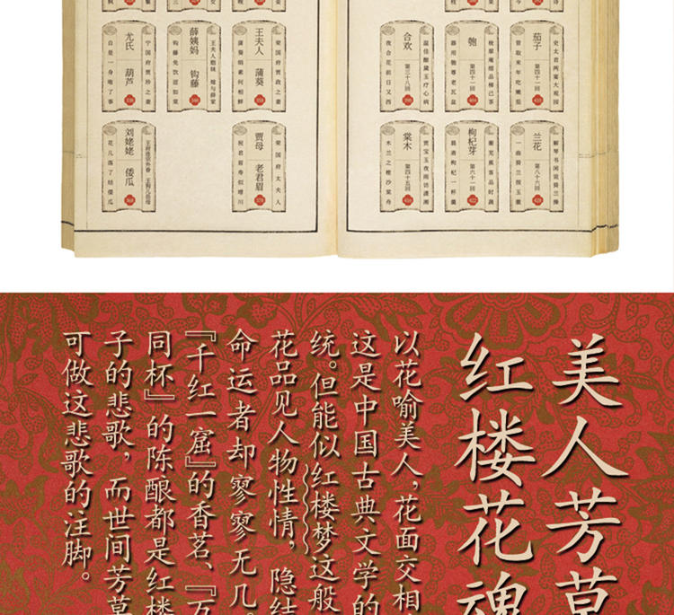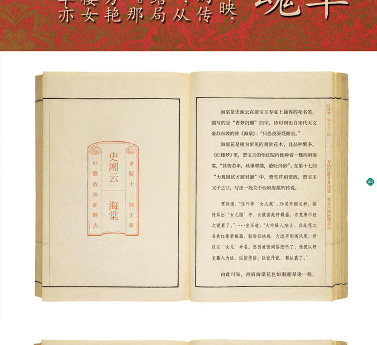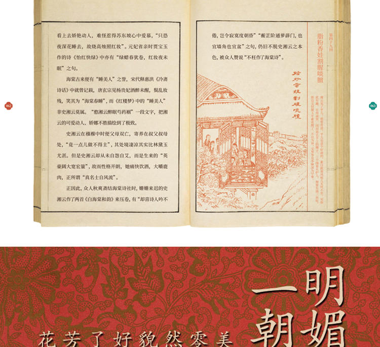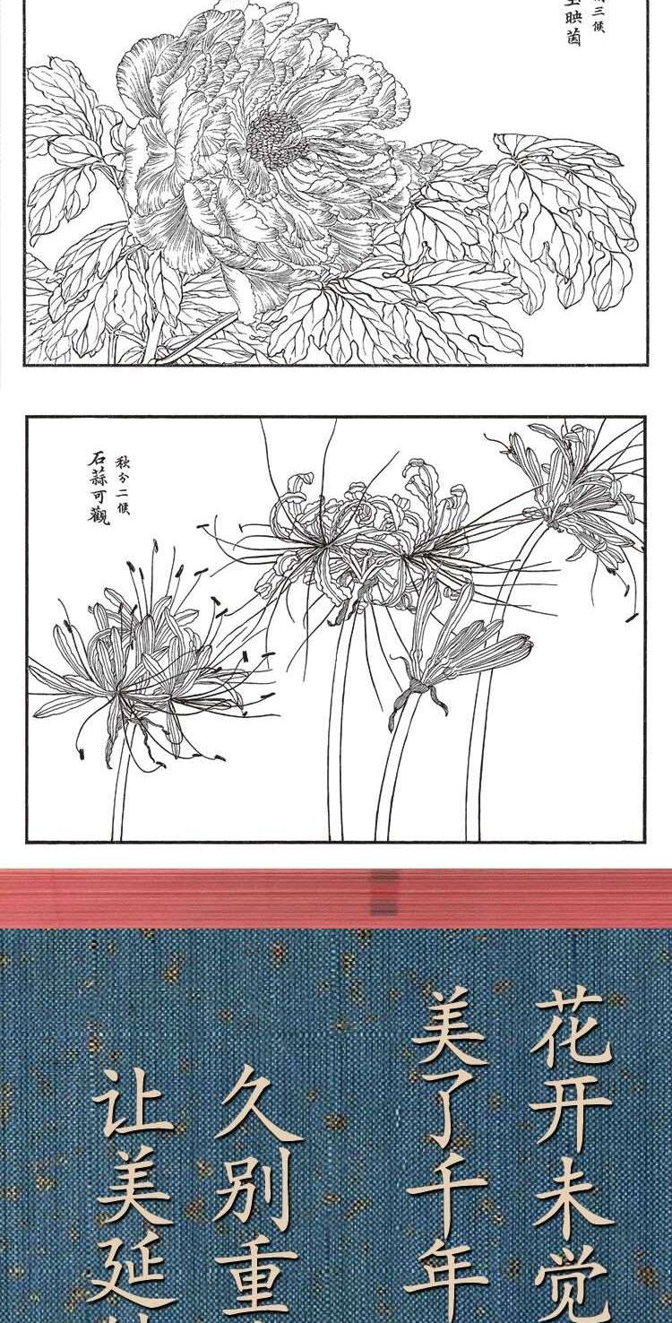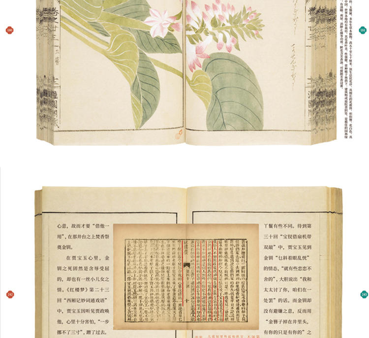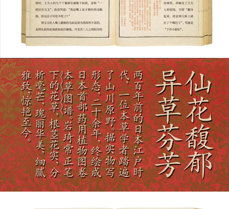 《幾回清夢到花前:紅樓女子的草木情緣》由《紅樓夢》原文提取或引申,以花喻人,探討了《紅樓夢》中四十三位女性的花草映射和八種可窺見精雅生活的代表植物,配有五十餘幅日本江戶時代有名本草學家岩崎常正《本草圖譜》手繪原稿及九十四幀清光緒求不負齋《增評全圖足本金玉緣》繡像,將古典文學與植物學完美融合,角度獨特,為諸多“紅迷”提供了《紅樓夢》的另一種打開方式。裝幀設計方面延續《美了千年,卻被淡忘:詩經名物圖解》以及《花開未覺歲月深:二十四節氣七十二候花信風》的“書中書”形式,裸脊鎖線裝訂,三面朱紅色刷邊。圖美、文美、設計美,是一本的品味紅樓文化的良心之作。