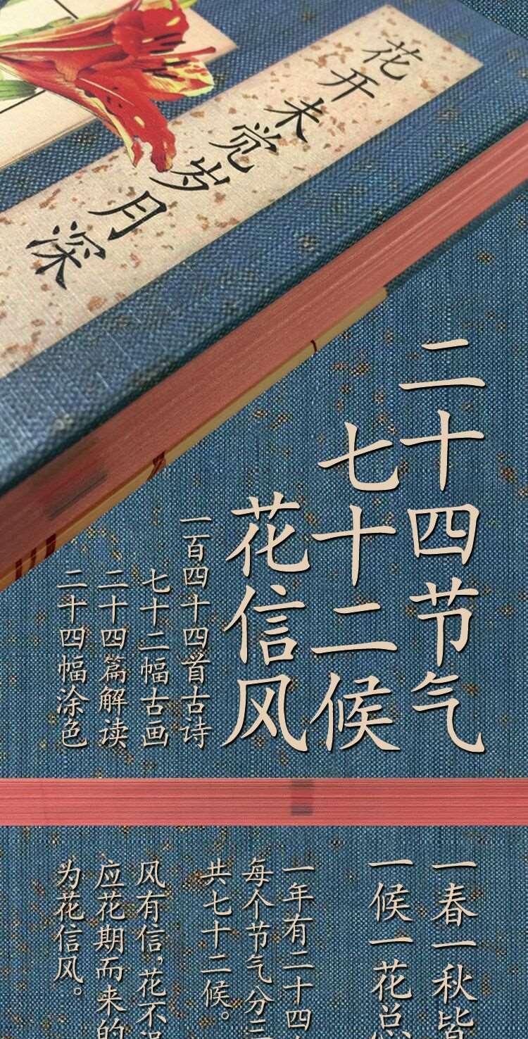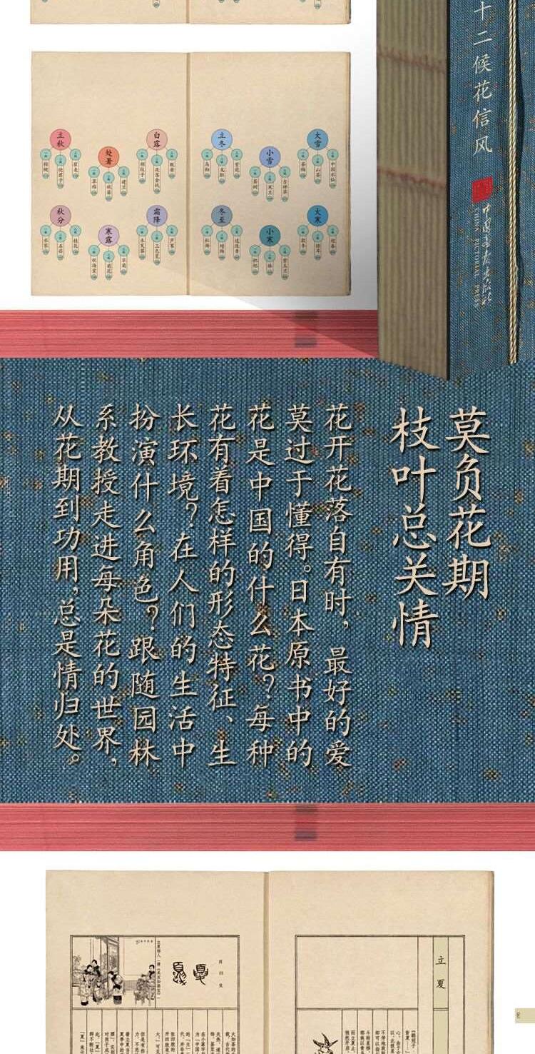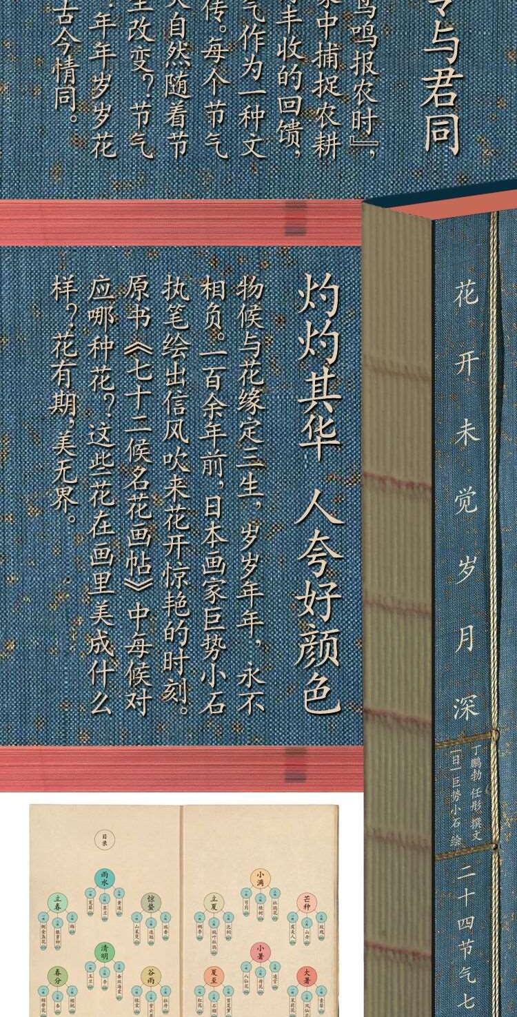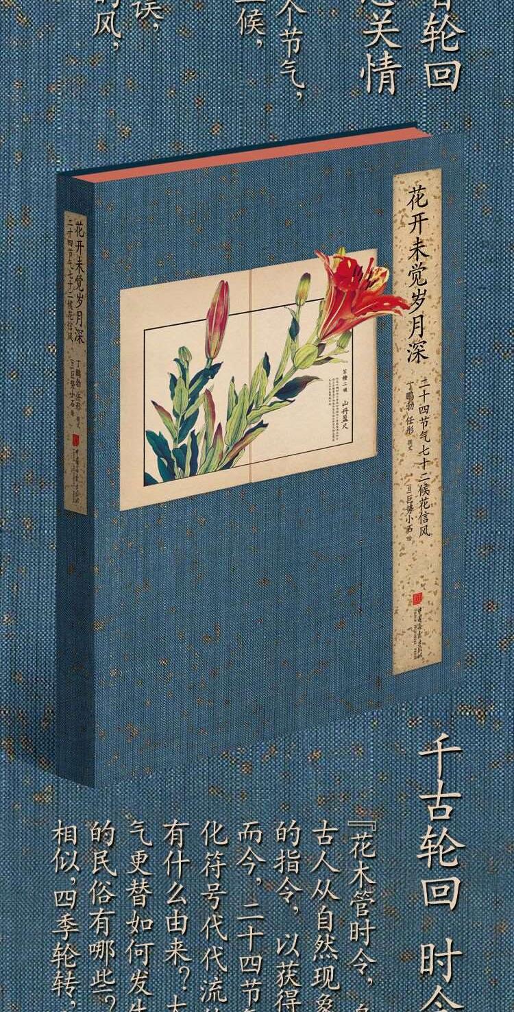 一年二十四節氣共七十二候。各候均以一個物候現象相應,稱候應。其中植物候應有植物的幼芽萌動、開花、結實等。 《花開未覺歲月深(二十四節氣七十二候花信風)(精)》由中國國家博物館副研究館員丁鵬勃和民俗專家任彤做時令節氣的文字撰寫,由中國農業大學園藝學教授義鳴放做名花鑑賞,輔以日本明治時期畫家的精美畫作以一年四時的各種古詩詞,主要介紹一年中節氣的變化及植物的相應更替。圖畫精緻,文字古雅,裝幀精美。
