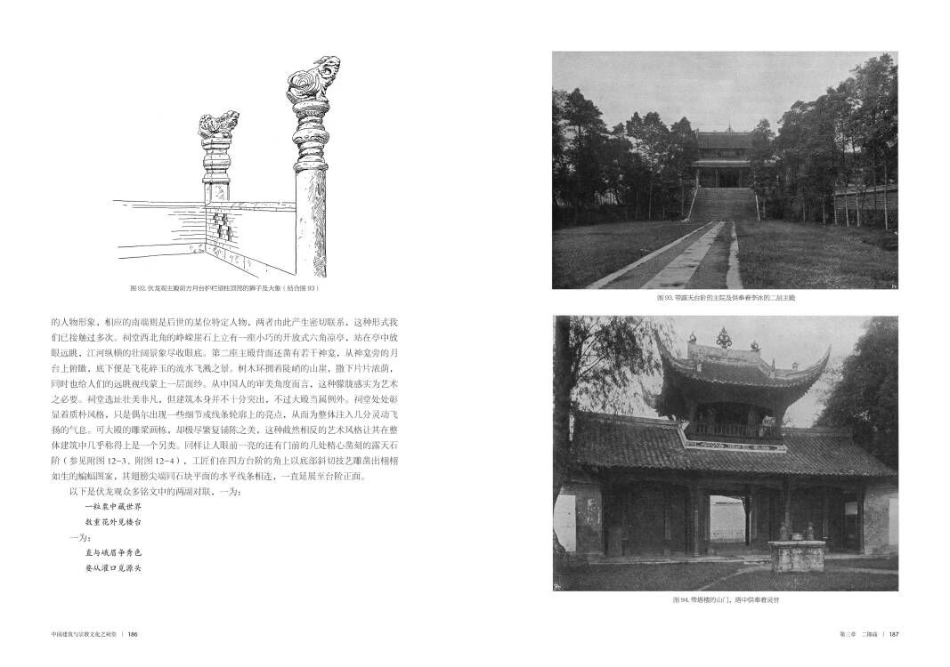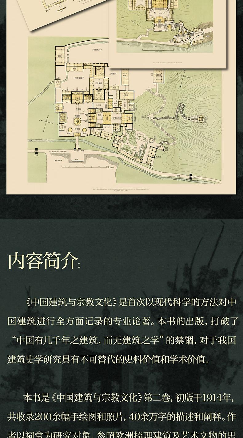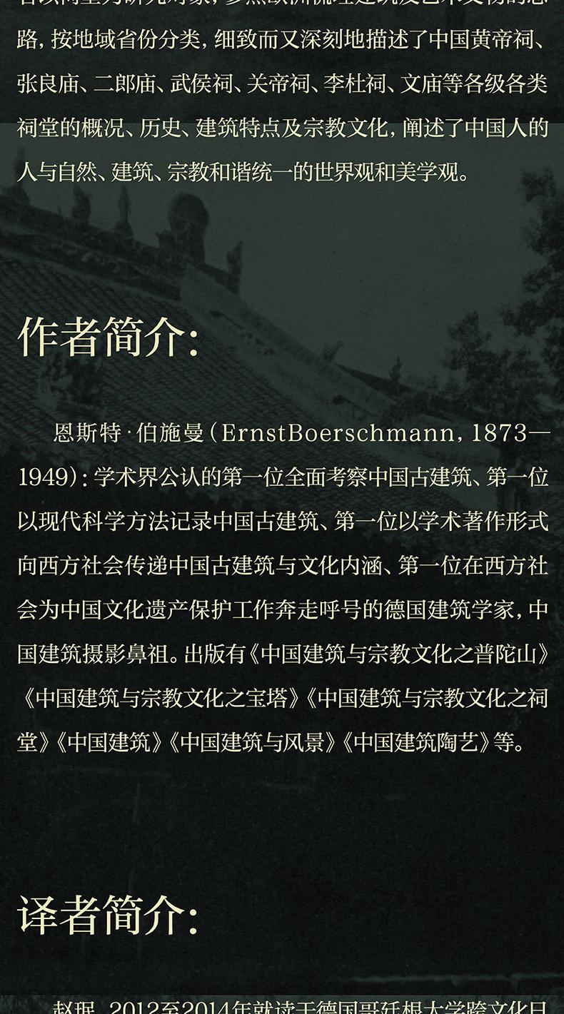 本書是《中國建築與宗教文化》第二卷,初版於1914年,共收錄200餘幅手繪圖和照片,40餘萬字的描述和闡釋。作者以祠堂為研究對象,參照歐洲梳理建築及藝術文物的思路,按地域省份分類,細緻而又深刻地描述了中國黃帝祠、張良廟、二郎廟、武侯祠、關帝祠、李杜祠、文廟等各級各類祠堂的概況、歷史、建築特點及宗教文化,闡述了中國人的人與自然、建築、宗教和諧統一的世界觀和美學觀。
