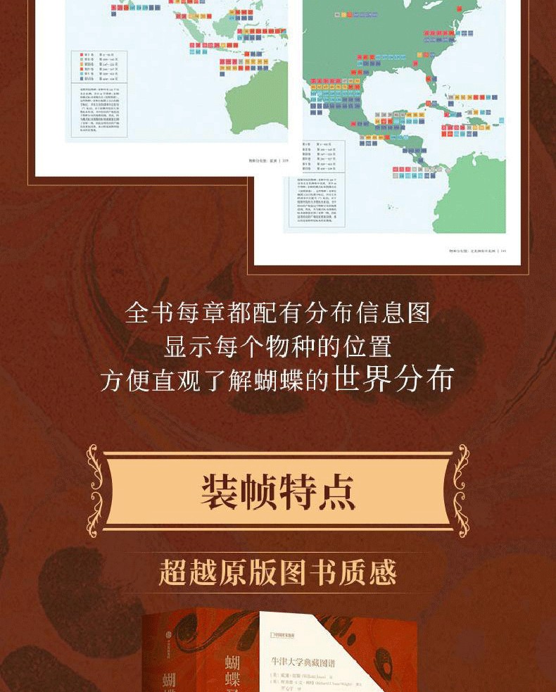 文字部分由牛津大學權威昆蟲學家理查德·I·文-賴特完成,保留並梳理了瓊斯的原始記錄,增加了對原書資料的考證和鱗翅目研究進展,根據*的分類系統定名和 資訊考證,提供了現代分類學名稱以及物種註釋,方便讀者閱讀。 此外,本書也間隔散佈著6張分佈資訊圖,顯示每個物種的位置,方便直觀了解蝴蝶的世界分佈。