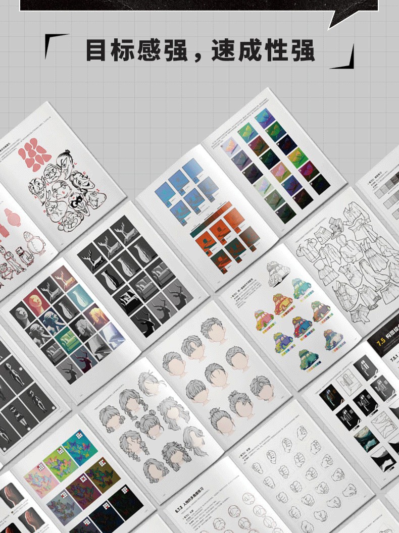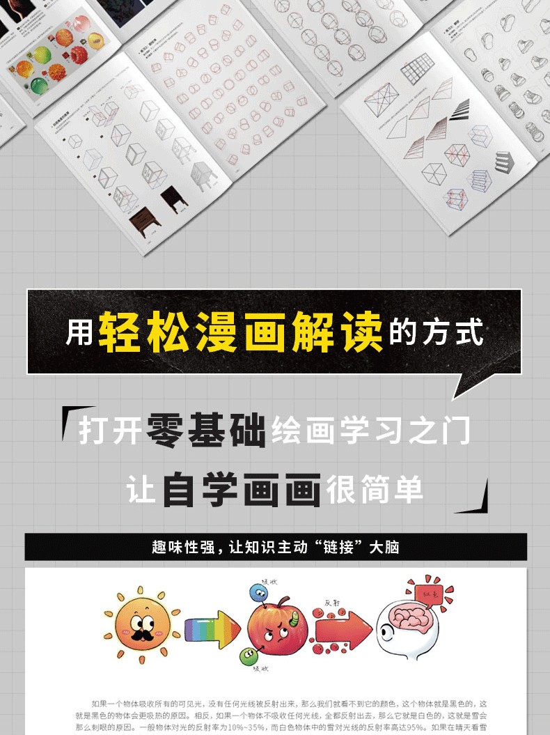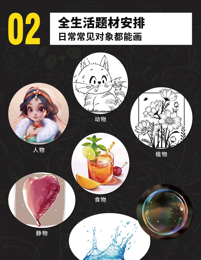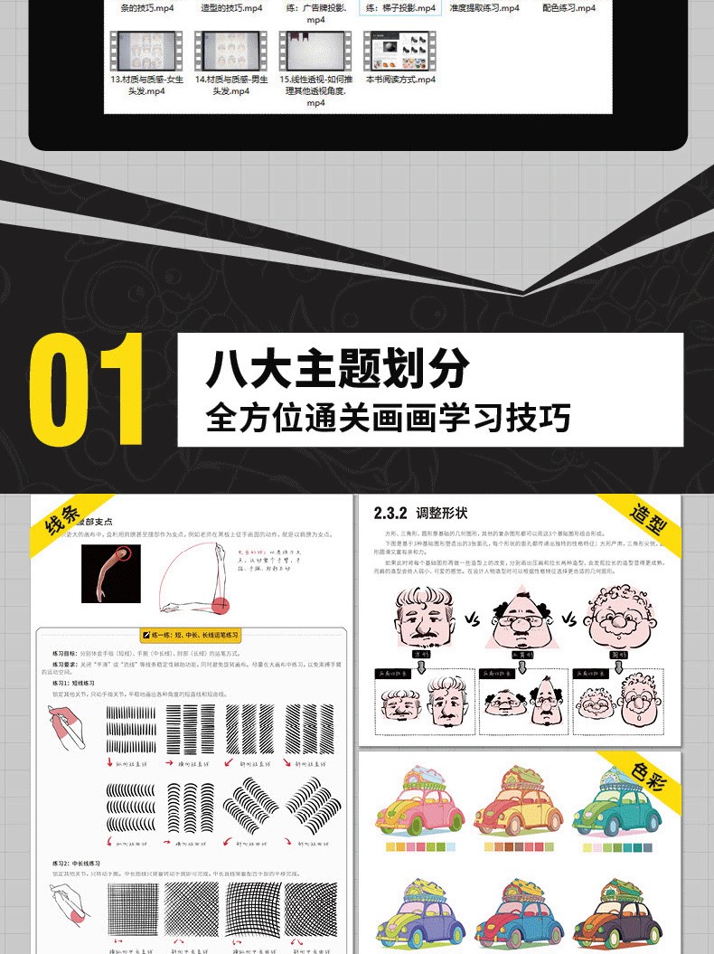 2.分主題講解,涵蓋線條、造型、光影、色彩、材質、透視、構圖、創作,每一部分詳細剖析,全指導跟練+專項自練