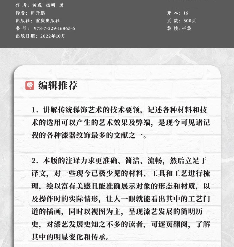 本版《髹飾錄》的註解者,為四川遂寧的宋瓷專家田開鵬君,配有600餘幅插圖(含手繪),以直觀解析中國古代髹漆技藝所必備的各種原料、工具 ,各種漆器的形態和製法,以及髹飾過程中因操作不當可能產生的弊病等,是一部技藝精到、研習有序的髹漆工藝傳世名作。