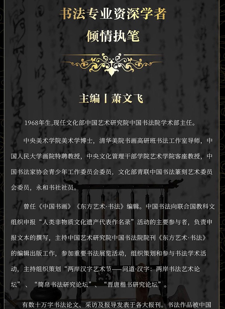書法的演變發展與興衰更替、書寫主題的變化及書法家的風格特徵與文脈傳承、帝王喜好風尚及當時社會思想形態對書法都產生各方面的影響,本書從書法藝術不同階段的概述、代表書法家的作品介紹、解析,向讀者展開了一條歷史脈絡清晰的書法藝術發展的詳細介紹,便於讀者輕鬆鳥瞰浩瀚的中國書法史。